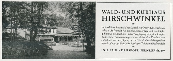W 1913 roku rozpoczęła się budowa nowego zajazdu leśnego Hirschwinkel. Nowy budynek stanął za willą Butsch. Uroczyste otwarcie miało miejsce w 1914 roku.